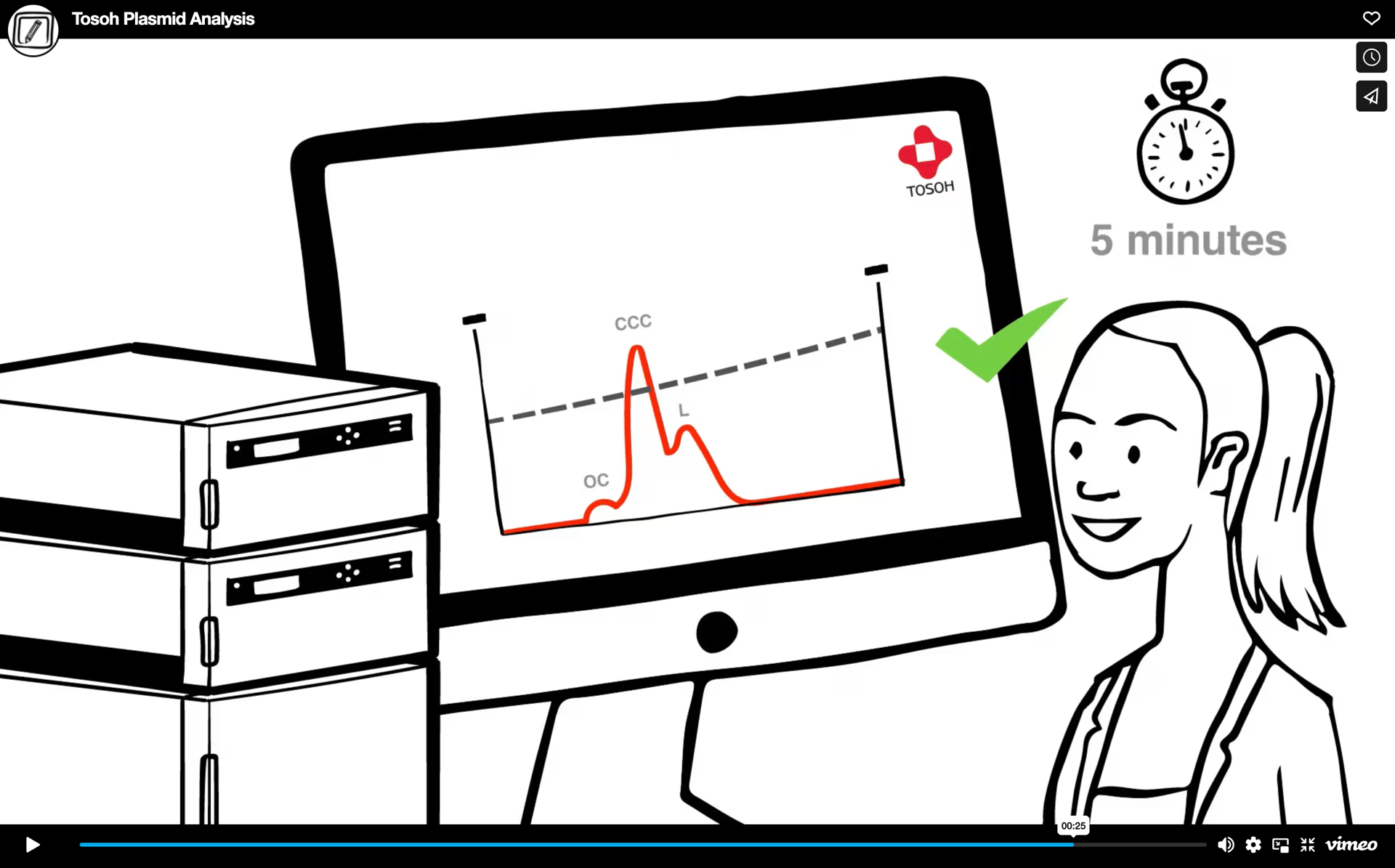 The video contrasts two methods for analyzing plasmid preparations: traditional agarose electrophoresis, which takes 1.5 to 2.5 hours, and Tosoh’s HPLC method using the TSKgel® DNA-NPR anion exchange column, which delivers results in just 5 minutes. A Tosoh representative introduces the HPLC solution, highlighting its speed and efficiency compared to conventional techniques.